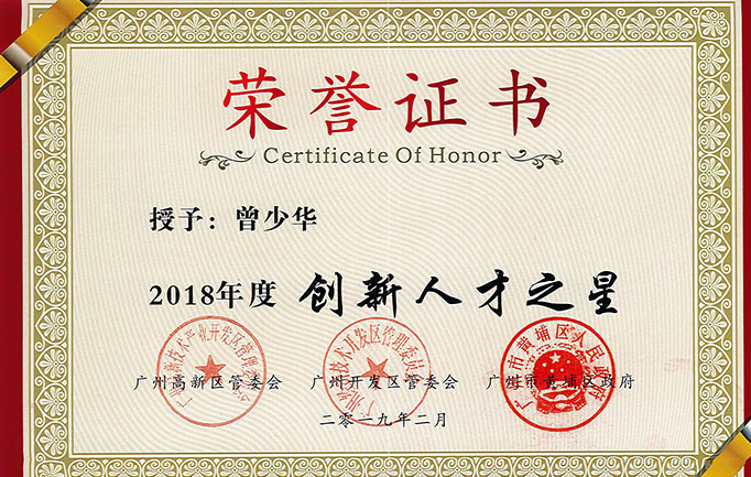 Prof Chan Siew Hwa was awarded "Star of Innovative Talents 2018" at the Science and Technology Innovation and Entrepreneurship Conference of Guangzhou Development District, Guangzhou, China on Friday 22 February 2019.