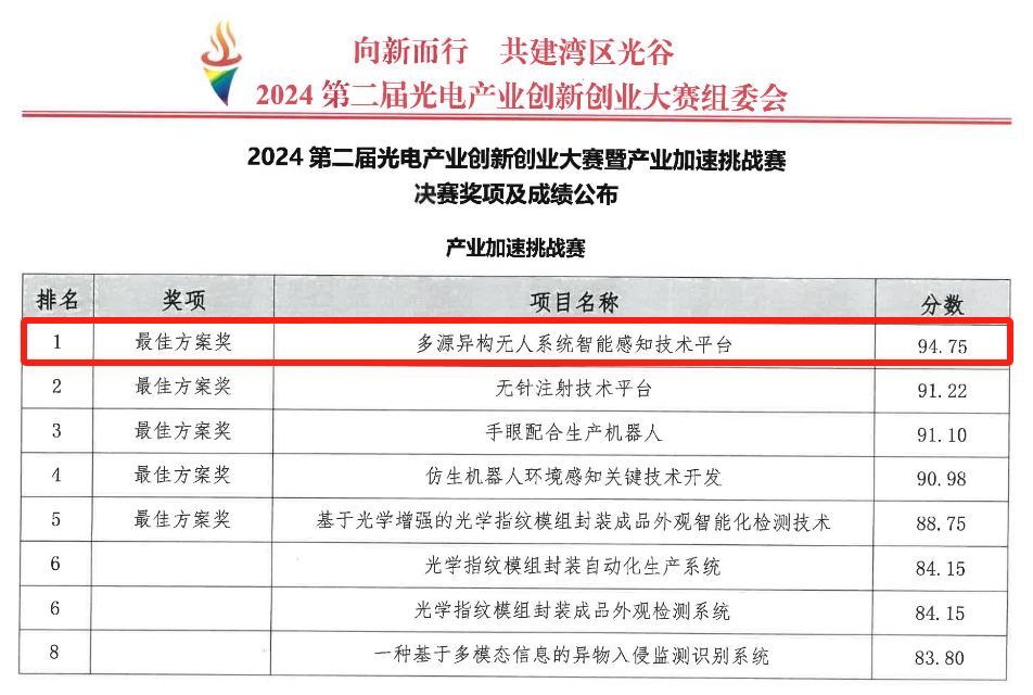 12月5日,研究院“多源异构无人系统智能感知技术”项目在2024第二届光电产业创新创业大赛中,以揭榜挂帅赛道第一名的优异成绩荣获最佳解决方案奖。该项目是研究院智能感知创新研发中心的核心项目之一,王郸维教授团队创新性地提出了针对轨道交通行业的异物侵入监测预警的多模态鲁棒感知方案,可通过固定式部署和列车车载式搭载两种模式,实现全天候、高速运行场景下轨道交通领域的异物入侵检测、测距、3D定位等功能,有效提高轨道交通领域运行安全和效率。