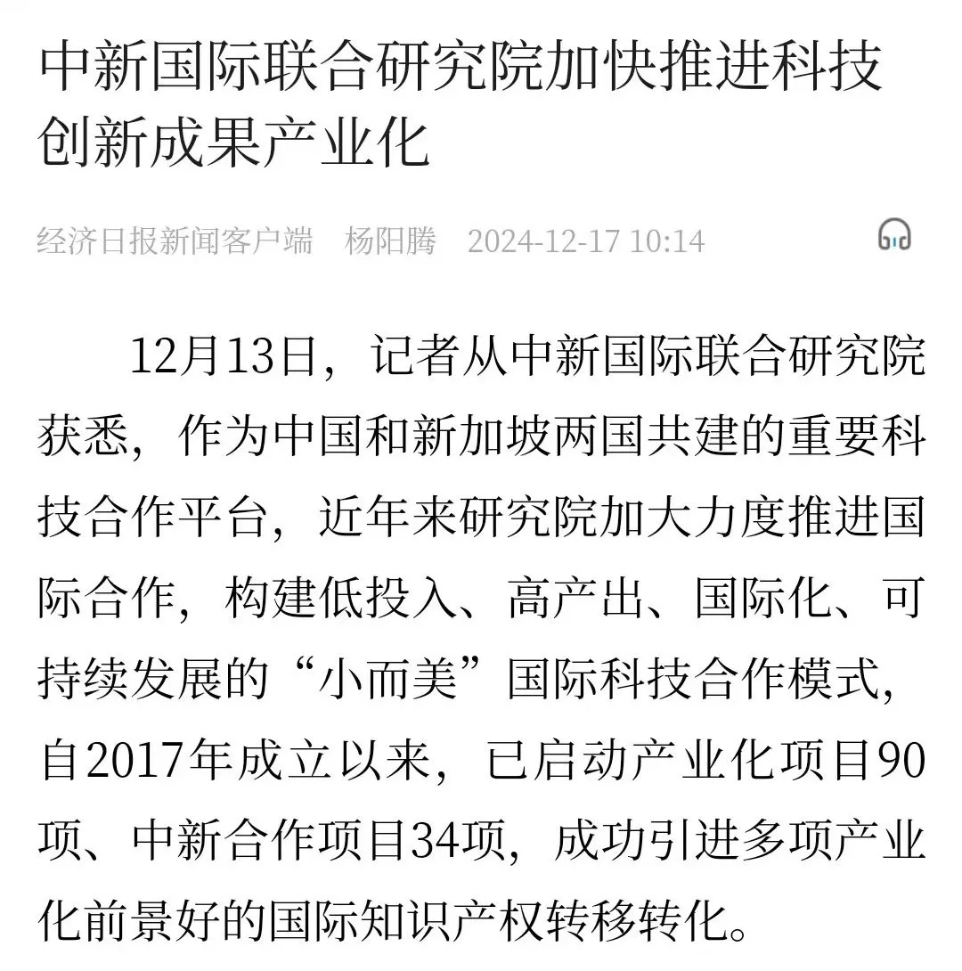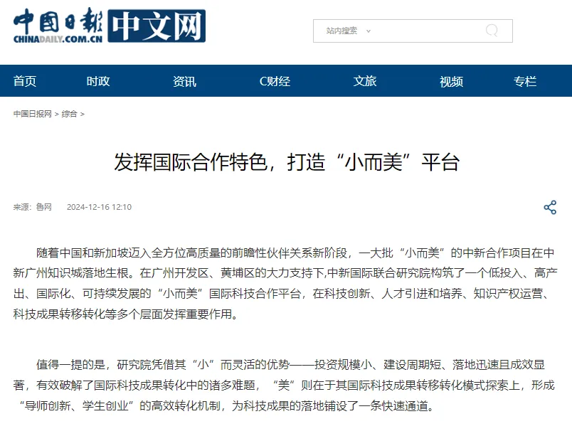 随着中国和新加坡迈入全方位高质量的前瞻性伙伴关系新阶段,一大批“小而美”的中新合作项目在中新广州知识城落地生根。在广州开发区、黄埔区的大力支持下,中新国际联合研究院构筑了一个低投入、高产出、国际化、可持续发展的“小而美”国际科技合作平台,在科技创新、人才引进和培养、知识产权运营、科技成果转移转化等多个层面发挥重要作用。