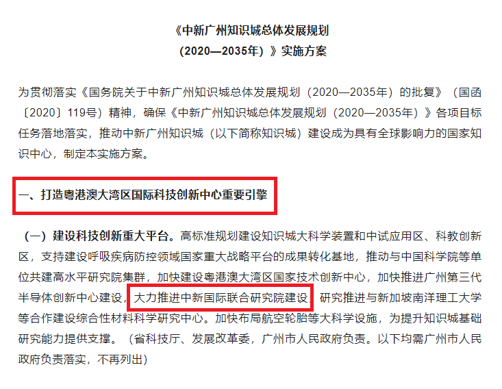 近日,广东省人民政府正式印发《〈中新广州知识城总体发展规划(2020—2035年)〉实施方案》(下称《实施方案》)。《实施方案》设置“打造粤港澳大湾区国际科技创新中心重要引擎”“打造高水平对外开放新平台”两大专题,多次提及中新国际联合研究院(下称研究院),明确提出“大力推进中新国际联合研究院建设”“加快建设中新国际联合研究院等协同创新平台”等要求,赋予了研究院更多新任务和新机遇。