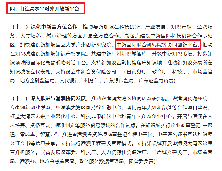 在建设科技创新重大平台方面,《实施方案》围绕建设国际科技创新典范目标,支持研究院加快建设进度,实现两国产学研协同发展,聚焦专精特新科技项目成果落地转化,联手打造粤港澳大湾区高水平的对外开放新平台,支持知识城更好融入国家发展大局。