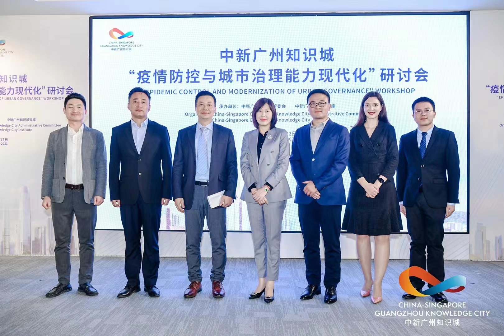(从左至右:广州科瑞投资服务有限公司副总经理李清波 、中新国际联合研究院副院长顾海文、知识城开发建设办公室副主任徐晖、科学城(广州)投资集团有限公司副书记彭月梅、中乌(黄埔)国际创新研究院院长韩昕超、中乌(黄埔)国际创新研究院外联部主任安娜、中新广州知识城开发建设办公室科技和知识产权处王靖宇)