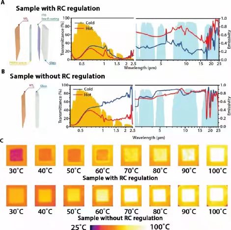 面对这一问题,南洋理工大学龙祎与美国怀俄明大学谭刚,华中科技大学杨荣贵合作,提出了同时调控太阳光波段及长波红外波段的理想智能窗户模型。研究团队指出:理想的智能窗户需要同时调控太阳光和长波红外线以达到最佳的节能效果。基于这一模型,作者设计并制备了自响应太阳光-长波红外双调控智能窗户(RCRT窗户)。该窗户在低温的长波红外发射率为0.21,与市售低辐射玻璃相近;在高温时,该智能窗户的长波红外发射率增加至0.61。同时,本款智能窗户的太阳能调制能力(ΔTsol)为9.3%。这款玻璃已经申请新加坡专利。