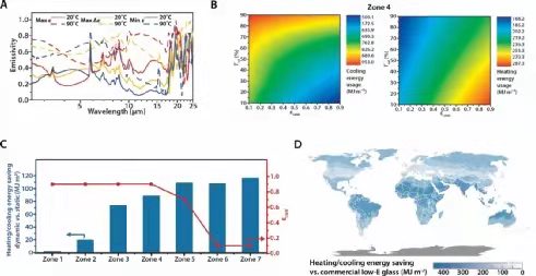 在基于自响应太阳光-长波红外双调控智能窗户光学数据的实际建筑耗能计算机模拟中作者发现:相比于传统的太阳光调控智能窗户和市售低辐射玻璃,双波段调控智能窗户在全球各气候区,尤其是四季分明的气候区,具有显著的节能优势。与市售低辐射玻璃相比,双波段调控智能窗户最高可节约324.6MJ/m2的制冷/制热能耗。