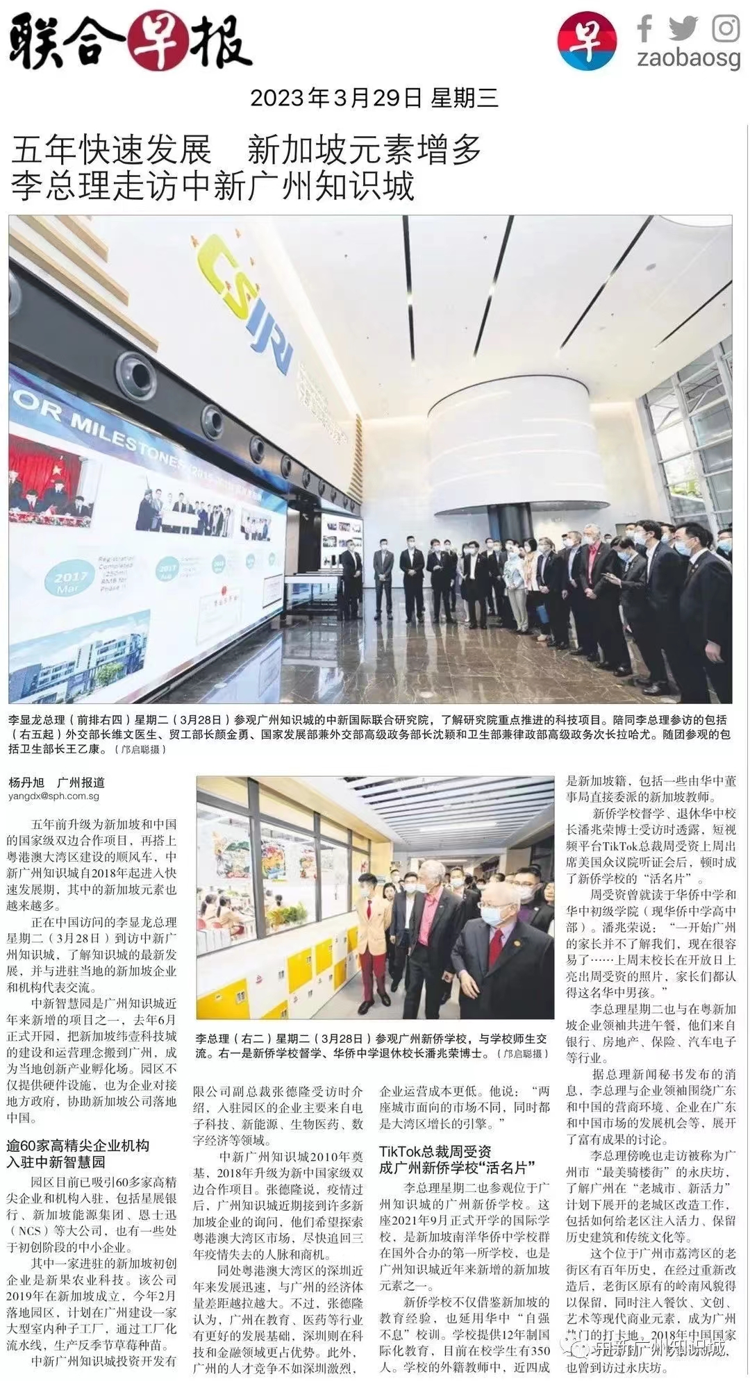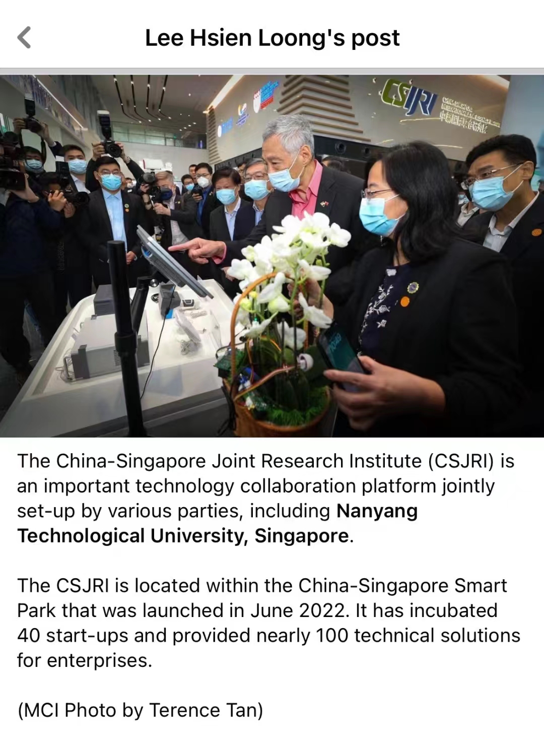 行程结束后,李显龙总理在社交媒体分享:“中新国际联合研究院是由新加坡南洋理工大学参与建设的重要技术合作平台。研究院位于2022年6月启用的中新智慧园。目前,研究院已孵化了近40家初创企业,成功为企业提供了近百项解决方案。”