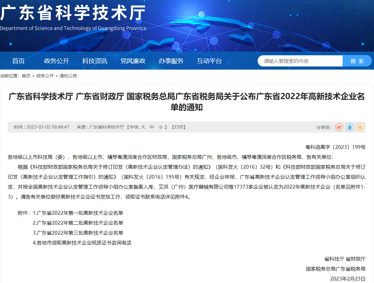 近日,广东省科学技术厅、广东省财政厅、国家税务总局广东省税务局正式公布了广东省2022年高新技术企业名单,广州英赞生物科技有限公司、广州态好生物科技有限公司、广州市九州旗建筑科技有限公司、广东管辅能源科技有限公司、广州鸿威技术有限公司5家企业获2022年高新技术企业认定。