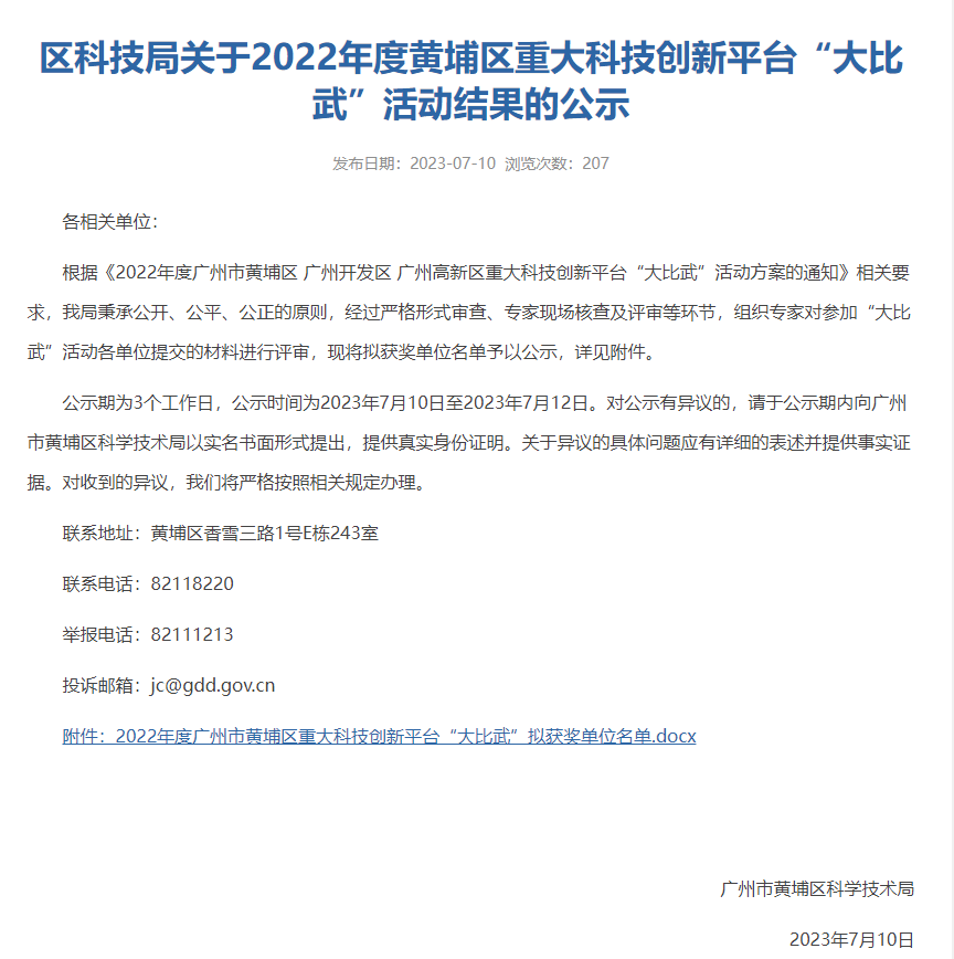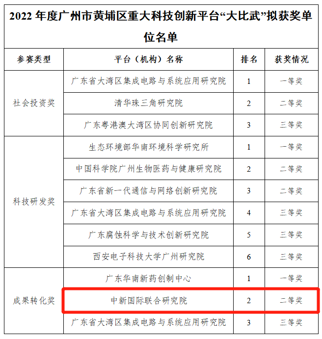 7月10日,广州市黄埔区科学技术局发布了《关于2022年度黄埔区重大科技创新平台“大比武”活动结果的公示》,中新国际联合研究院荣获黄埔区重大科技创新平台“大比武”成果转化类二等奖。