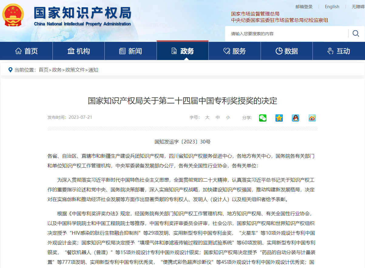 喜报!研究院2家企业获第二十四届中国专利优秀奖